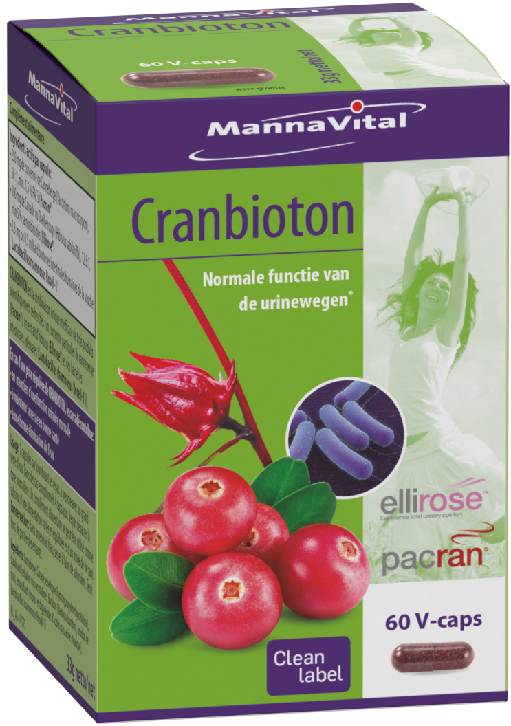 - 250 mg Veenbessenconcentraat (Vaccinium macrocarpon), 50:1, min. 1,5 % PAC’s (PACRAN®)