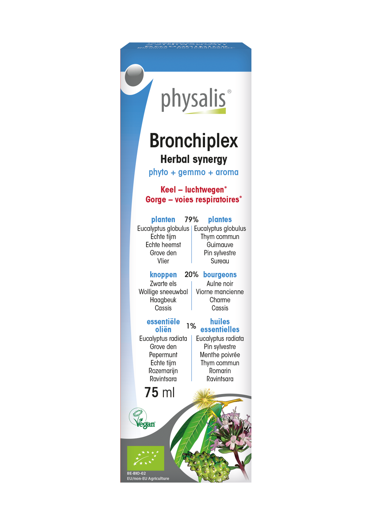 Een loopneus, onbedwingbare hoestbuien of een continu vermoeid gevoel? Ons lichaam krijgt jaarlijks wel wat winterkwaaltjes te verduren. Moeder natuur herbergt enkele natuurlijke hulpmiddeltjes die het ver-velendste kwaaltje kunnen helpen voorkomen of verzachten. Physalis Bronchiplex bio bevat eucalyptus, echte tijm, echte heemst, grove den, vlier en wollige sneeuwbal die een verzachtende invloed hebben op de keel en de luchtwegen en helpen om vrijer te ademen. Zwarte els, pepermunt en rozemarijn ondersteunen onze natuurlijke weerstand.